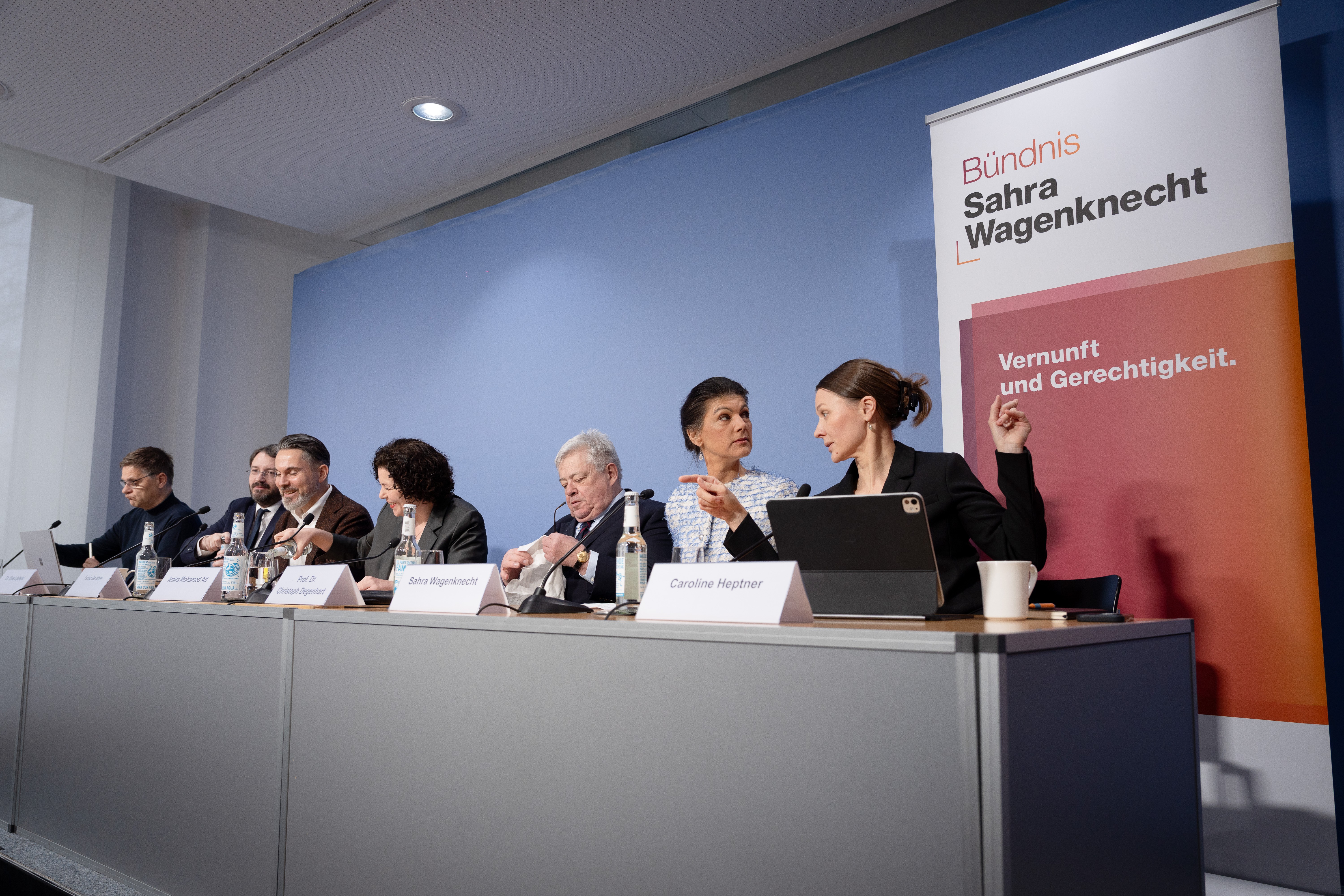 Berlin, Tagungszentrum, Bundespressekonferenz, Einreichung Wahlprüfungsbeschwerde, BSW, Sahra Wagenknecht, Fabio De Masi, Parteivorsitzender, Amira Mohamed Ali, Parteivorsitzende, Oliver Ruhnert, Generalsekretär, Christoph Degenhart, Uwe Lipinski