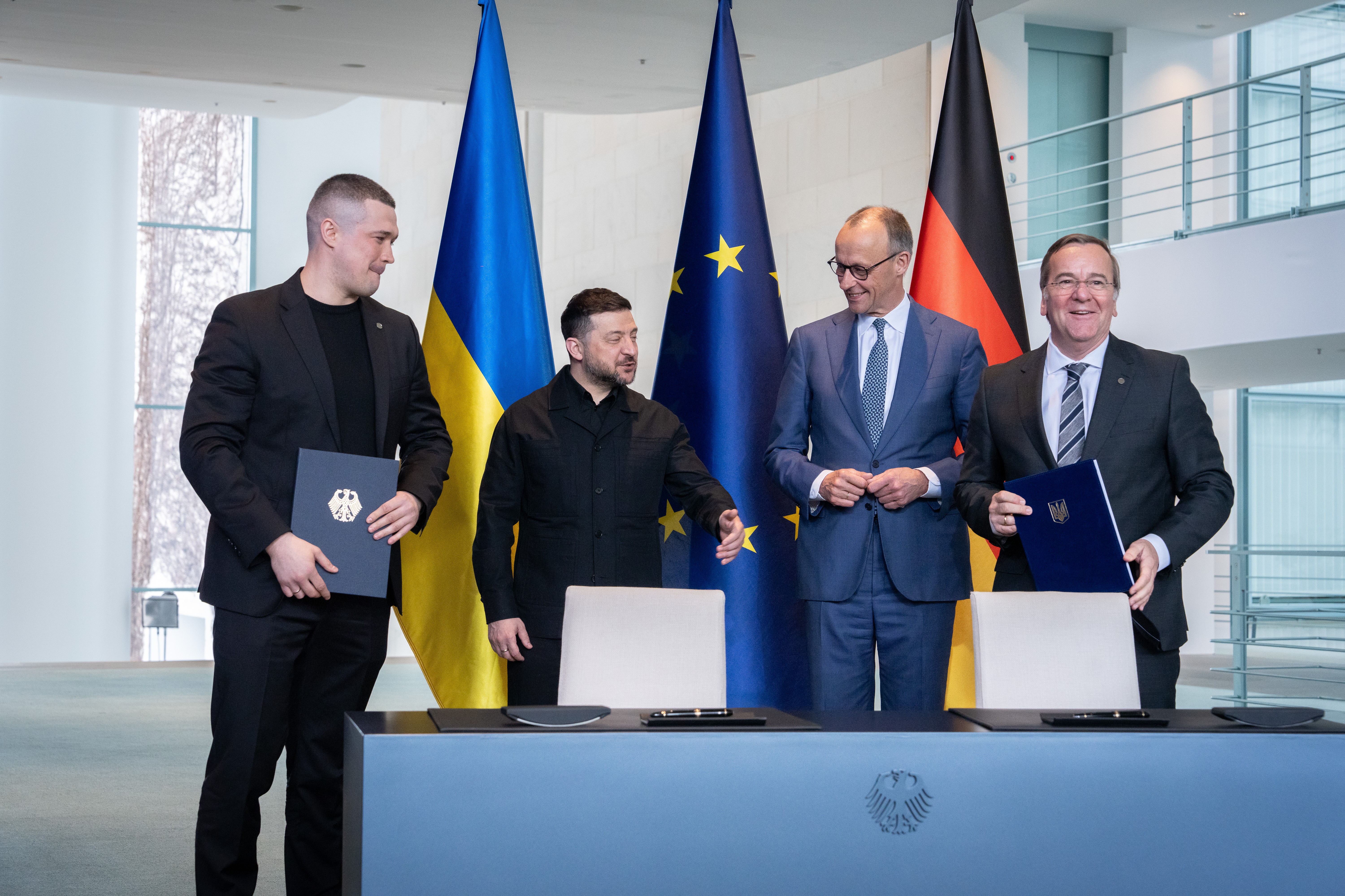 Bundesregierung, Bundeskanzleramt, Friedrich Merz, Bundeskanzler, Vertragsunterzeichnung, Ukraine, Präsident, Wolodymyr Selenskyj, Mykhailo Fedorov, Ukraine, Verteidigungsminister, Boris Pistorius